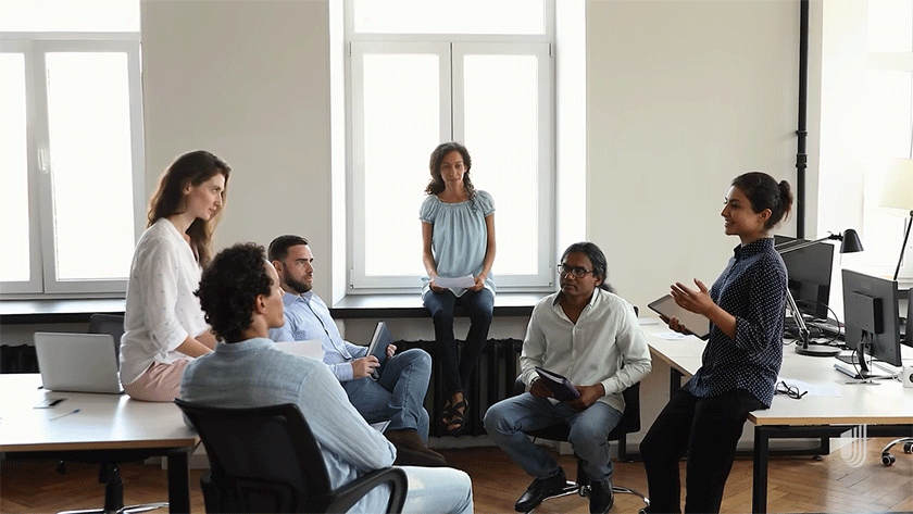 The video shows a montage of people working in different office settings.