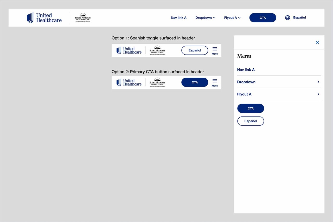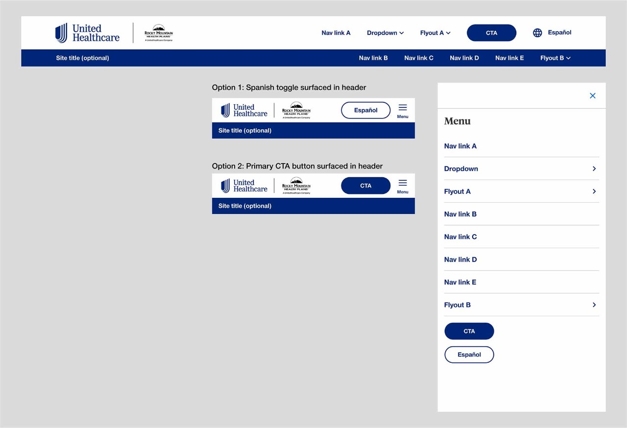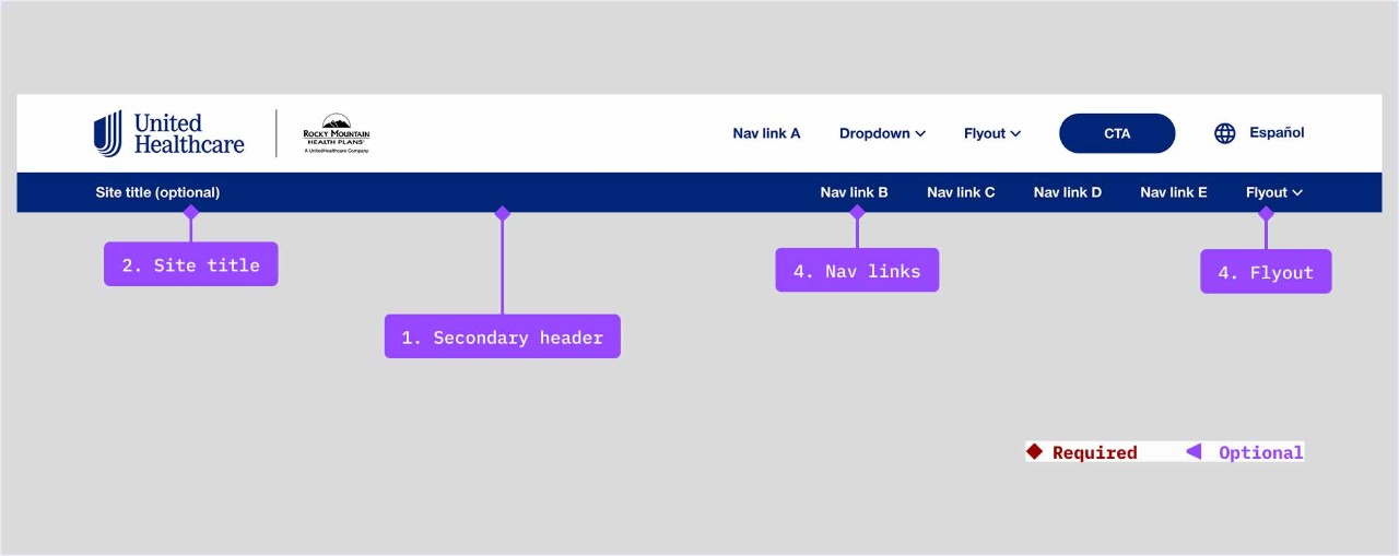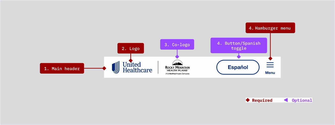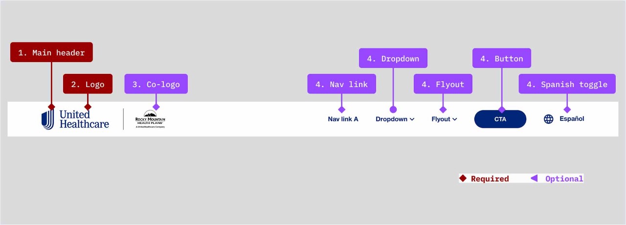 The main header is a required part of the Microsite Header component. A logo is required within the main header but a co-logo is optional depending on use case. Up to five navigation items can be placed within the main desktop header including links, dropdown link, flyout link, button, Spanish toggle.