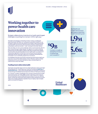 UnitedHealthcare actively seeks out and nurtures these relationships. By working hand-in-hand with hospital systems, clinics, pharmaceutical companies, leading tech innovators and policymakers, UnitedHealthcare is fostering a shared commitment to innovation. This collective approach leads to the development of more comprehensive solutions — from integrated care models to advanced diagnostic tools — and accelerates the pace of progress, ultimately benefiting everyone involved in or engaging with the health system.